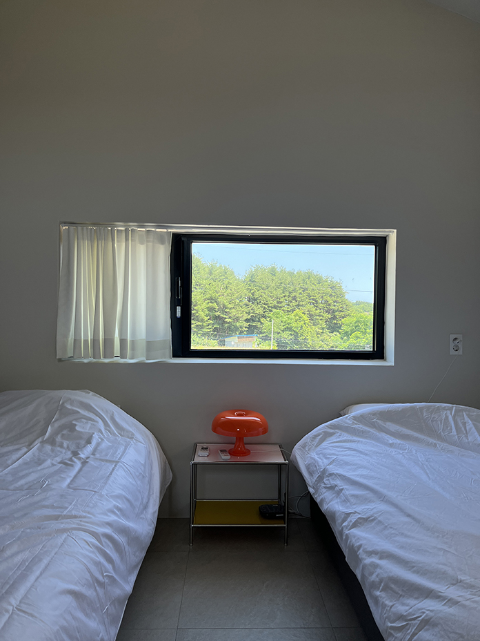 높은 층고와 부드러운 채광 아래 싱글 베드 두 개가 놓여 있으며, TV나 냉장고가 없어 오직 정적과 숨결만이 머무는 시간을 만끽 할 수 있습니다.